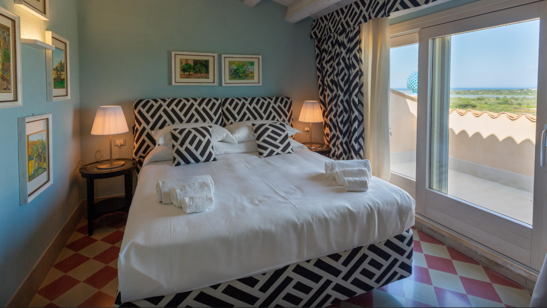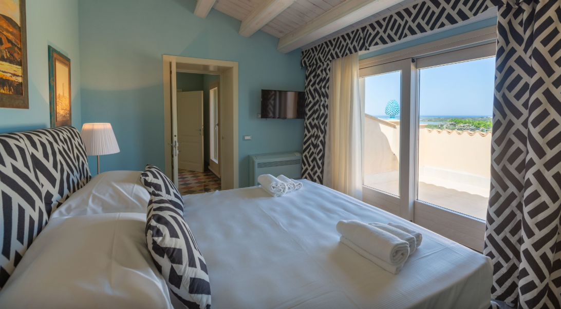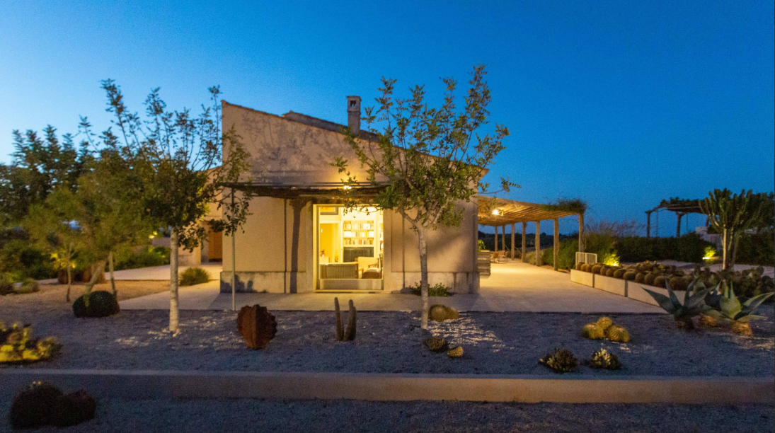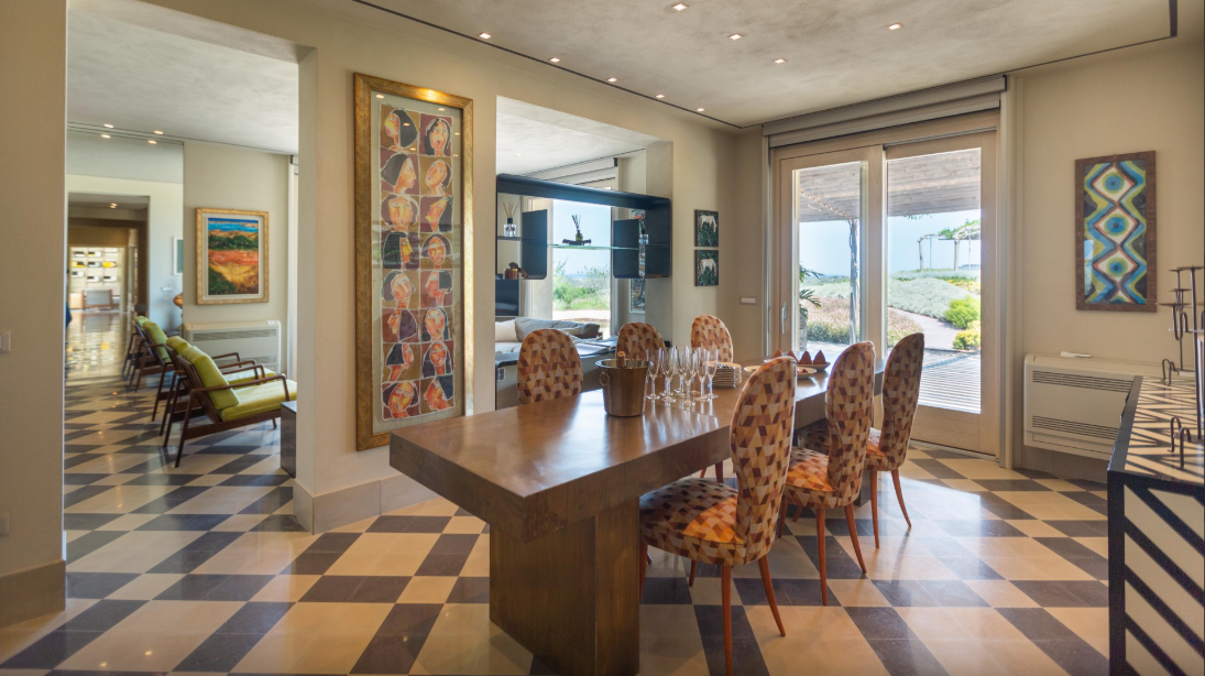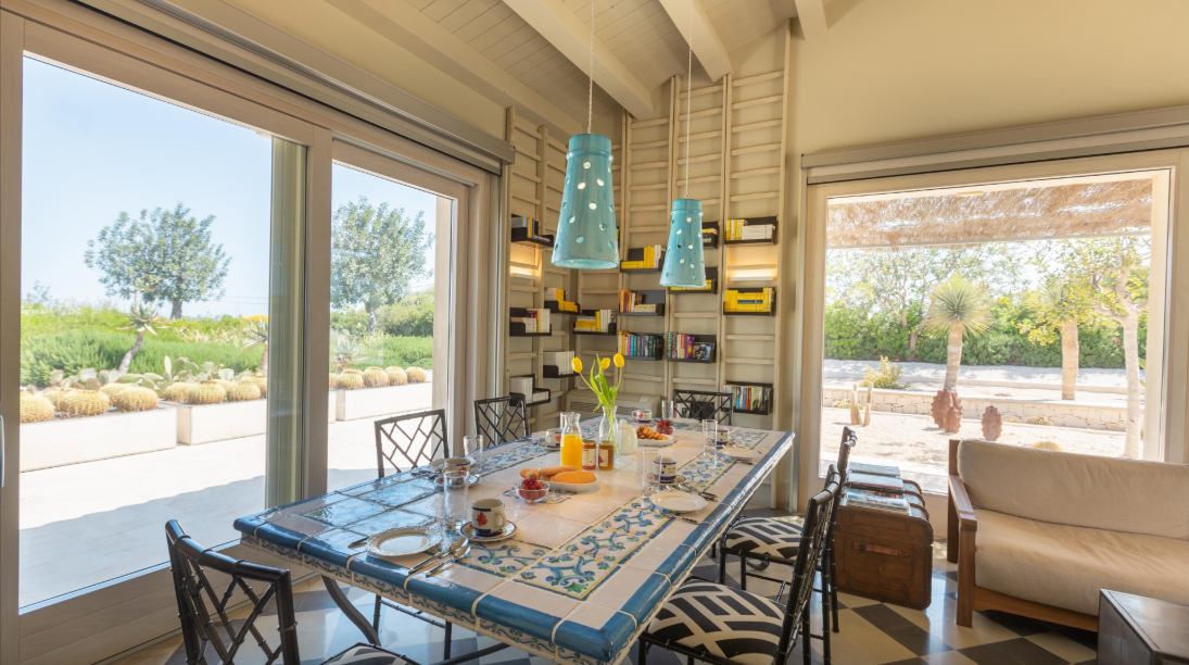 This fully air-conditioned villa has two floors. On the ground floor, an antique wooden door opens onto the main entrance which leads to the corridor and the bright informal living room, characterised by a sitting area with comfortable sofas and a rich bookcase, as well as a dining area with large windows overlooking the exterior. Also on this floor are two double bedrooms, each with ensuite bathroom, wardrobe and private access to the outside. In addition to the bedrooms, there is a formal dining room, which opens onto a terrace, and a second living room with double windows overlooking the beautiful garden. On the upper floor are two comfortable and elegant double bedrooms, each with ensuite bathroom, wardrobe and terrace with views of the countryside and the Vendicari marsh.