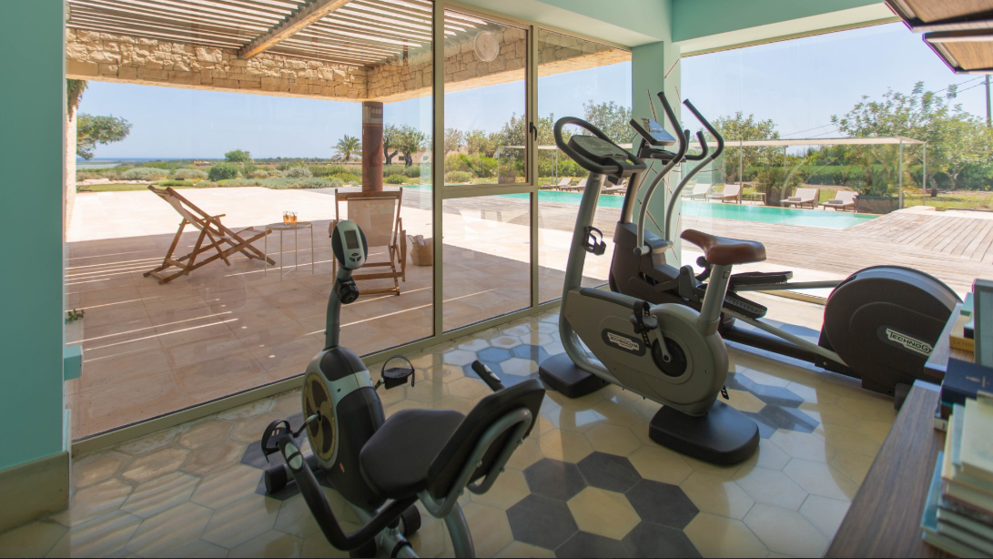 The swimming pool is located in a secluded position and not visible from the villa, which is about 50 m away, on a lower level of the garden. This rectangular infinity pool measures 16 x 4 m with the depth ranging from 1.20 to 1.80 m. Nearby is the changing room with hot-water showers and bathroom. There is also a small air-conditioned gym nearby. The pool is open from the last Saturday in April to the first Saturday in October.