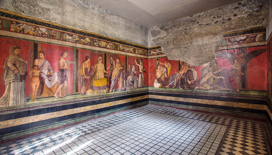 Due to its healthy climate and pleasant scenery, Pompeii was a holiday resort for wealthy Romans. It is now famous for its civic buildings lining the streets, which are still intact today. The Surgeon’s House, the House of the Faun and the House of Chaste Lovers are exceptional examples of the epoch’s architecture. Another unique building is the House of Mysteries, named after the murals depicting the Dionysian cult’s initiation rites (i.e., the mysteries).