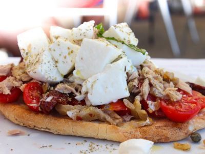 Back to my personal research about Montalbano’s food, in Scopello near Palermo, I discovered “Pane cunzato“, a type of bread baked in a wood oven stuffed with tomatoes, anchovies, oil and salt: it became my favourite sandwich to have on the beach!