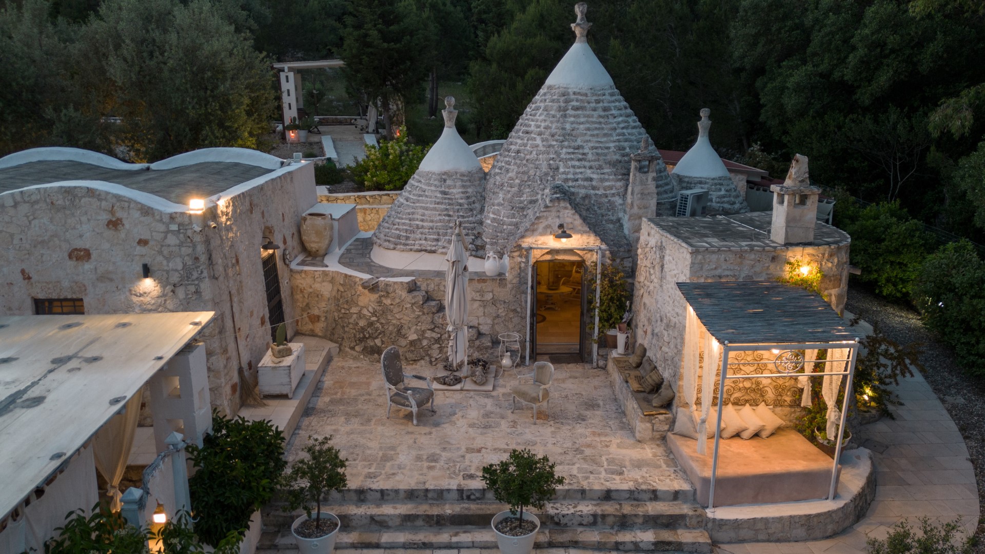 The property consists of four adjacent residential units, connected to each other by external paths. The main lamia, characterized by barrel ceilings and large glass walls, contains a bathroom with shower and a dining room with a large, well-equipped open kitchen, overlooking the courtyard with built-in barbecue and dining table and which leads to the patio with seating area. Beyond the large patio is the first family suite with bathroom with shower, built inside a trullo with three cones which contain, respectively, a small sitting room with ornamental fireplace, an alcove with double bed, and a single bed. A few steps from the trullo is the second suite (Lamia Tata) with a single bed in its spacious entrance and a double bedroom with en-suite bathroom complete with shower carved into the rock. The bedroom has a 15 sq m outdoor terrace with a stone tub for moments of pure relaxation. A short distance away is the last suite, Lamia Bruja, accessed across a 20 sq m patio used as a sitting room which, from its high point, offers a panoramic view of the Itria Valley. Within the structure is a double bedroom with en-suite bathroom with shower; this lamia is also equipped with an outdoor Jacuzzi built in the adjacent garden.