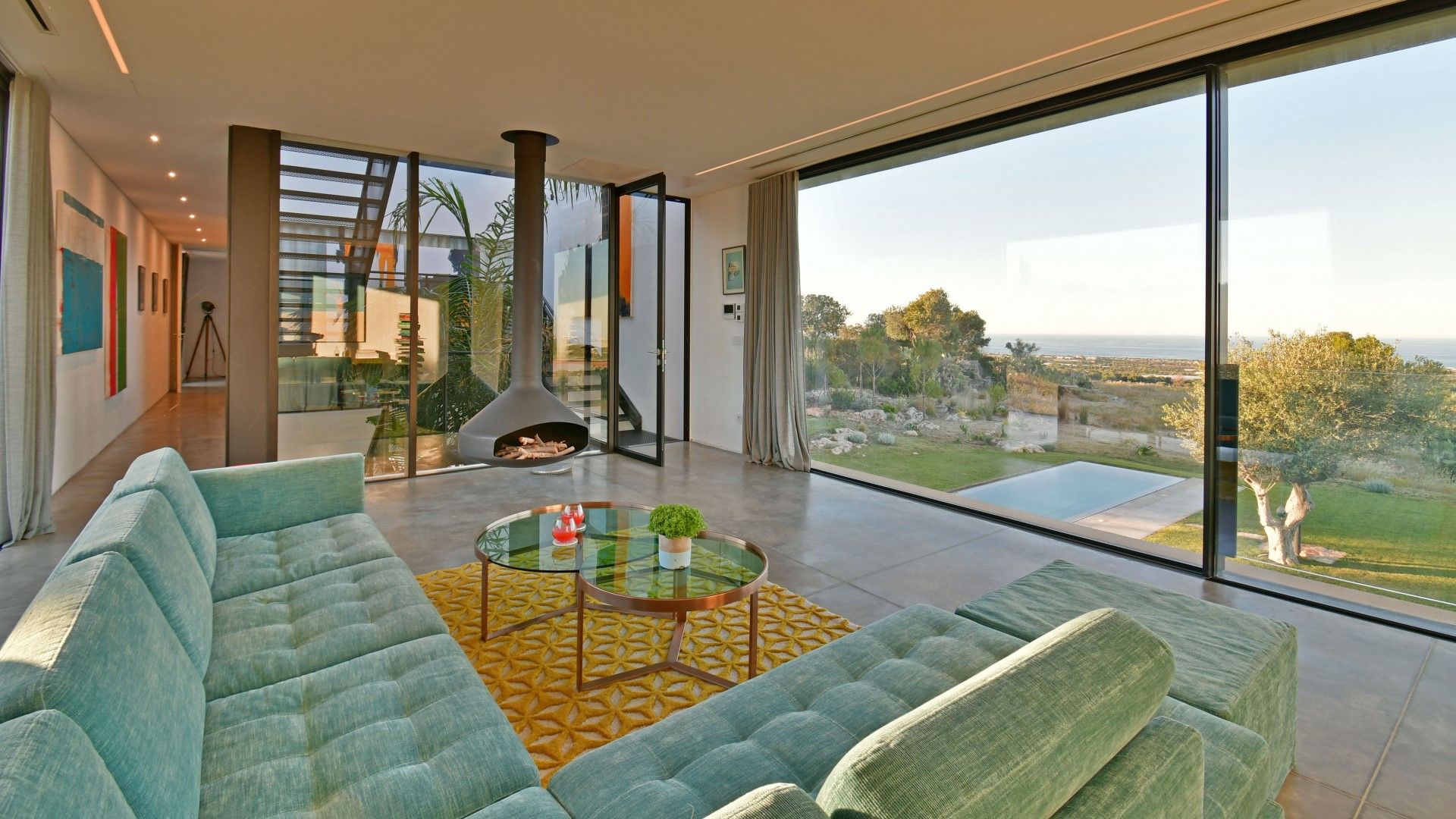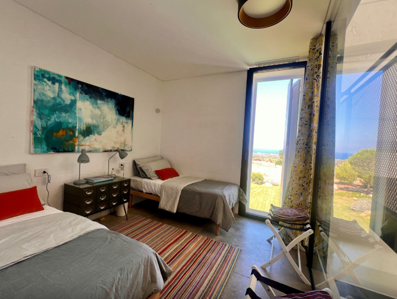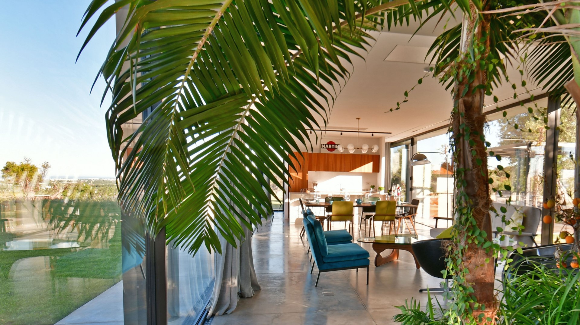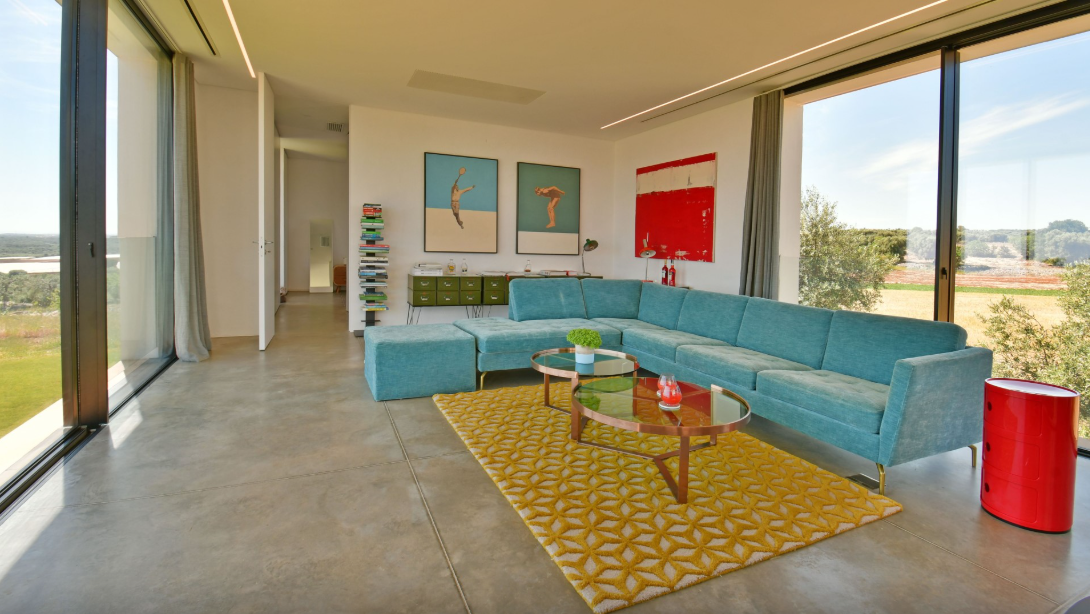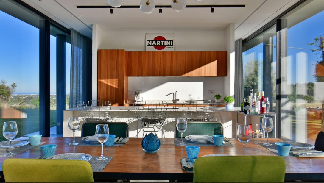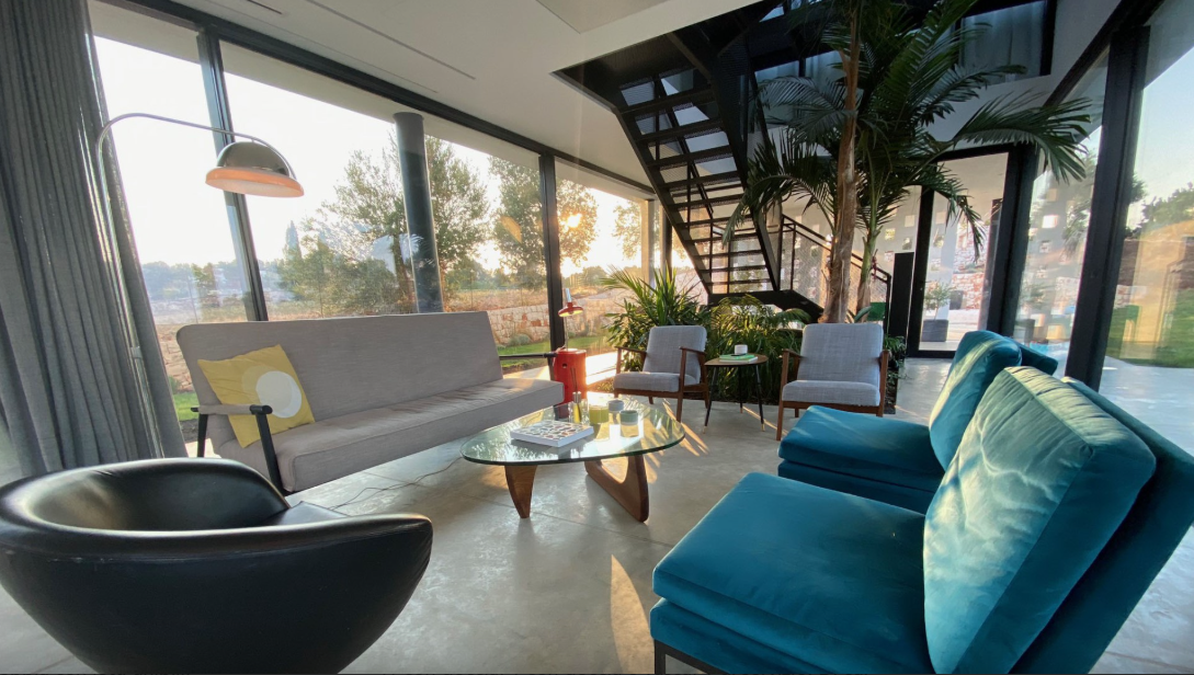 Perched on a UNESCO-protected hillside, the Villa blends seamlessly with its natural surroundings, creating a harmonious dialogue between architecture and landscape. Designed by acclaimed architect Daniele Corsaro from Grottaglie, the villa reflects a modernist aesthetic, inspired by Le Corbusier’s Pavillon House and the indoor-outdoor style of Californian architects such as Eames, Eichler, and Neutra. A standout feature is the internal courtyard garden, framed by a steel staircase and enriched with tropical plants, forming an integral part of the living spaces. Combining advanced technology with Apulian tradition, the villa’s exterior showcases local materials, including dry-stone walls and tuff stone. Spread over two levels, the villa is bright and welcoming, with large windows that fill every room with natural light. The ground floor features a multifunctional open space linking the living room, dining area, and kitchen, creating a convivial and dynamic atmosphere. Upstairs, the living area is centered around a suspended Gyrofocus fireplace, while vintage pieces, including Bertoia chairs, add charm and style.