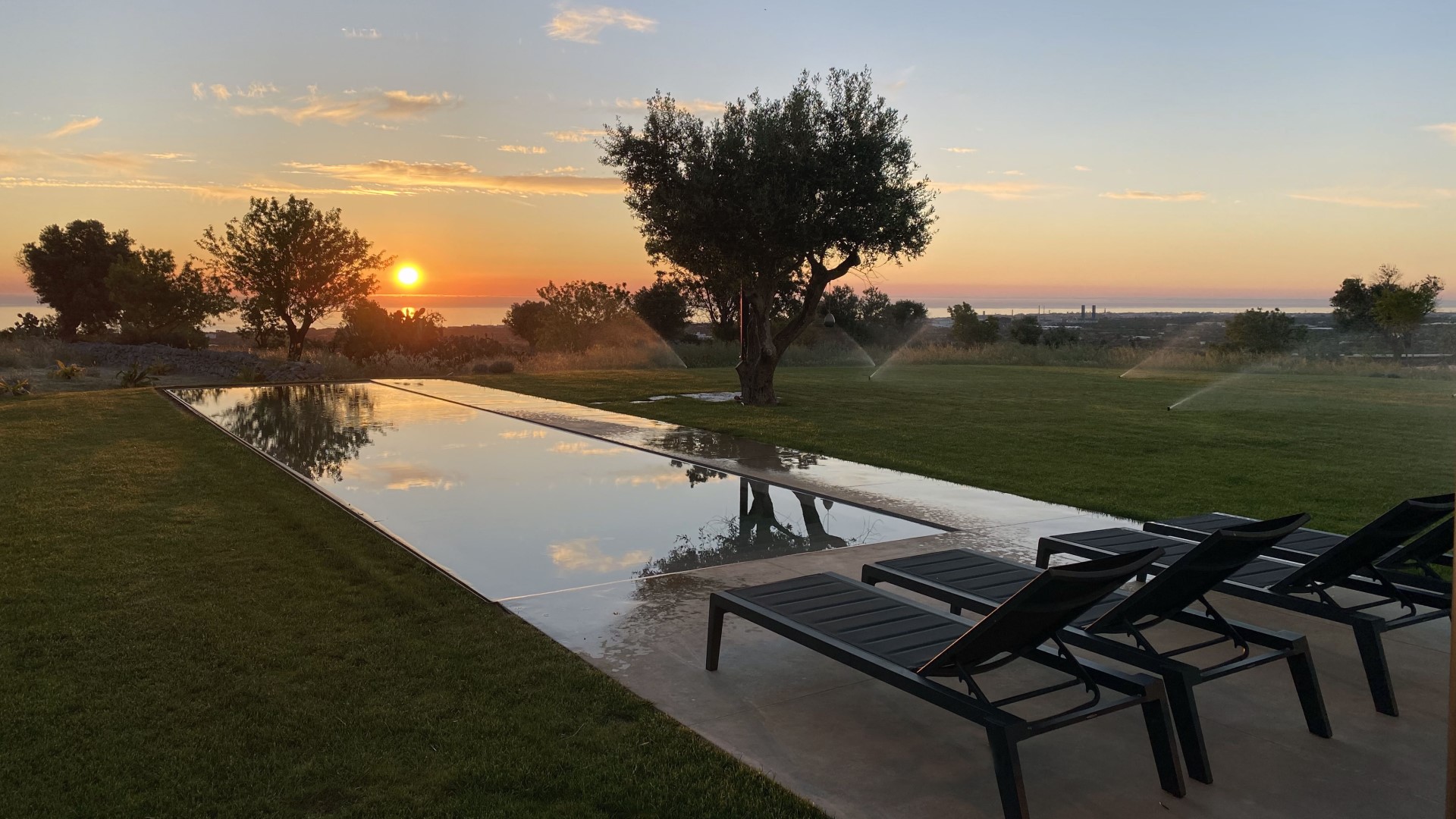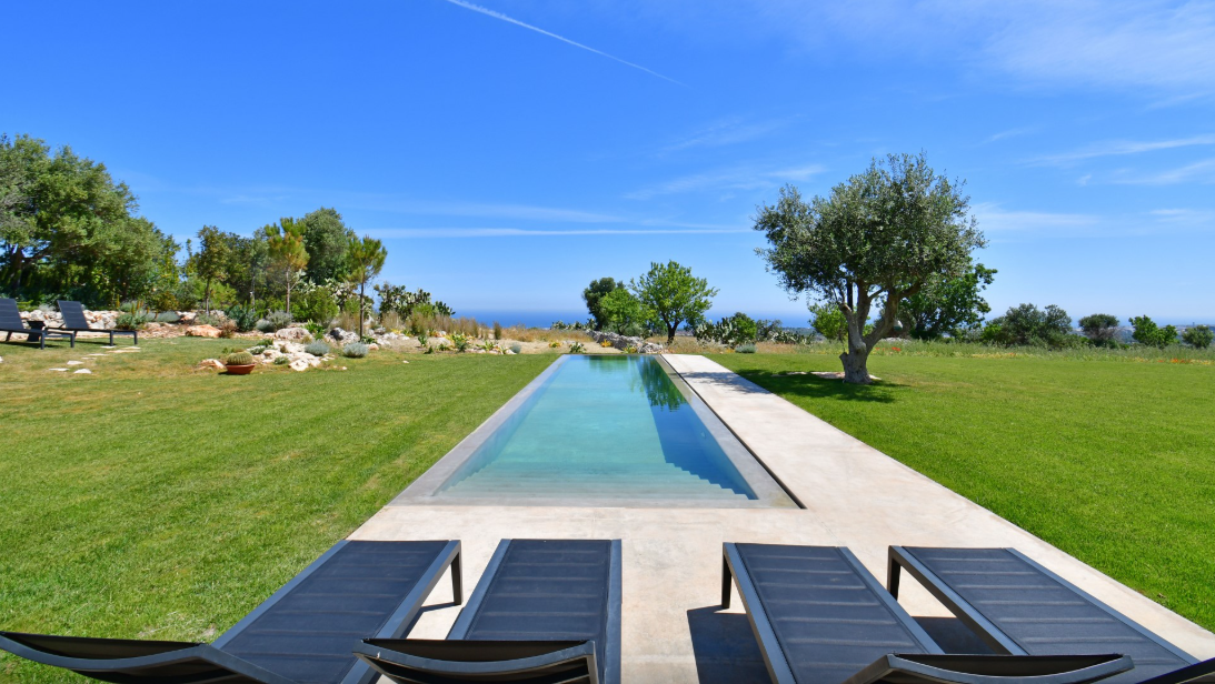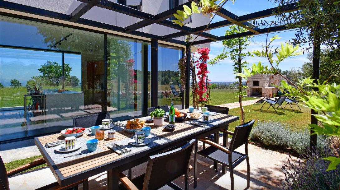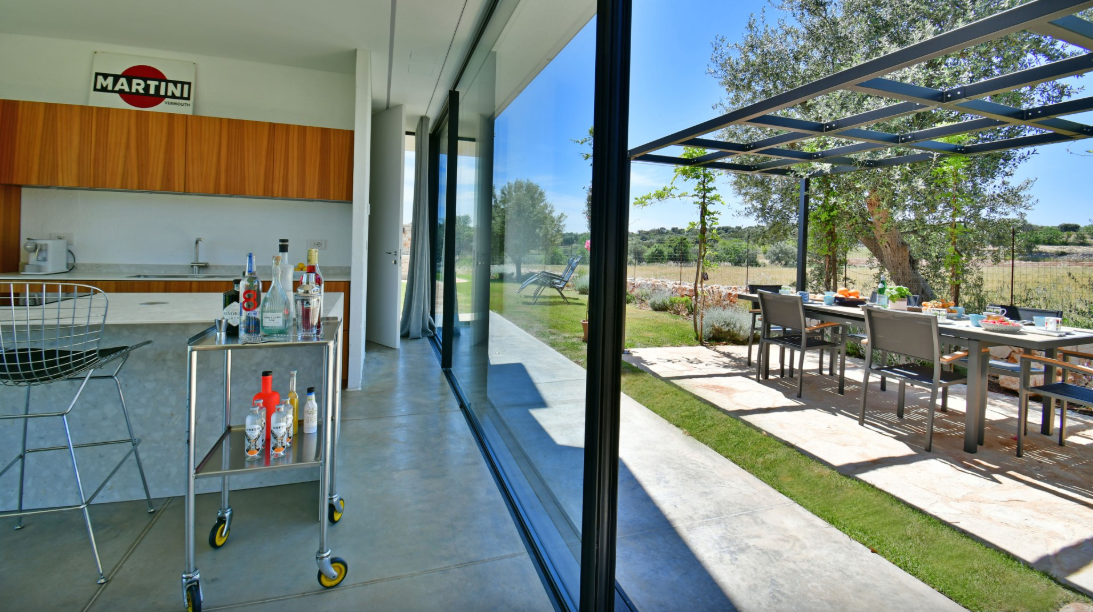 Large windows surround the villa, offering uninterrupted views of the surrounding countryside and centuries-old olive groves that stretch toward the sea of Polignano. A modern-design swimming pool lies in front of the villa, accompanied by a covered lounge area. At the back, a dining table shaded by a gazebo next to a wood-fired oven.
