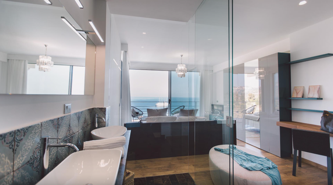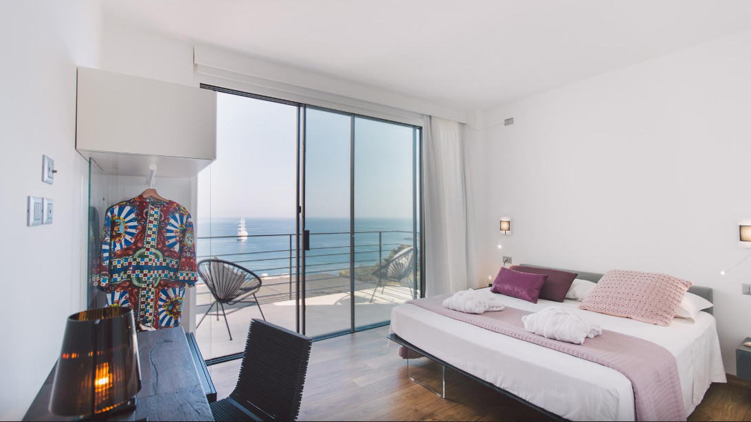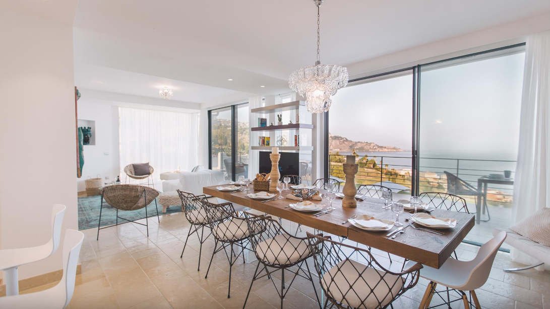 This modern villa is set on a panoramic hill in teh area of Giardini Naxos, with a breathtaking view of the sea, of Mount Etna and of Taormina. The house has welcoming, modern rooms of a high-level design and with colours providing a sensation of relaxation and comfort; moreover all the bedrooms have a beautiful sea view. Outside the villa are big, fully-equipped terraces and a large area, with infinity pool overlooking the panorama, and various relaxation corners. The villa’s position allows you to enjoy extraordinary sunrises over the sea from the bedrooms and from the pool area as well.