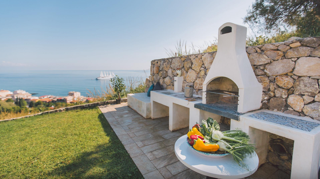 The property is surrounded by grounds of about 2000 sq m. The main part of the garden is on the panoramic side of the property where the swimming pool is also located. This area is cultivated with lawn, hedges, shrubs and plants typical of Mediterranean scrub. The large terrace of the main floor, with spectacular views of the sea, is organised as an outdoor living and dining area, completed by a barbecue.