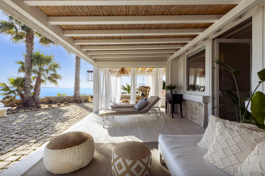 Wooden walkways, stone paths, and cobbled terraces connect the various buildings, immersed in a Mediterranean garden of about 4,000 sq m, with fragrant shrubs, lawns and flowers. Each cottage has a private bleached wooden terrace for each room, furnished with a shaded relaxation area. The heart of the property is the large terrace overlooking the sea, with an outdoor dining area, relaxation areas and panoramic corners. A path leads to the gate that opens onto a stone terrace by the sea, with a shaded pergola and sunbeds for relaxing between swims. Sunbeds are distributed across various terraces. The descent to the sea is private. Please note: the dry-stone walls typical of the area are very low and overlook the cliff, making the property unsuitable for children under the age of 10.