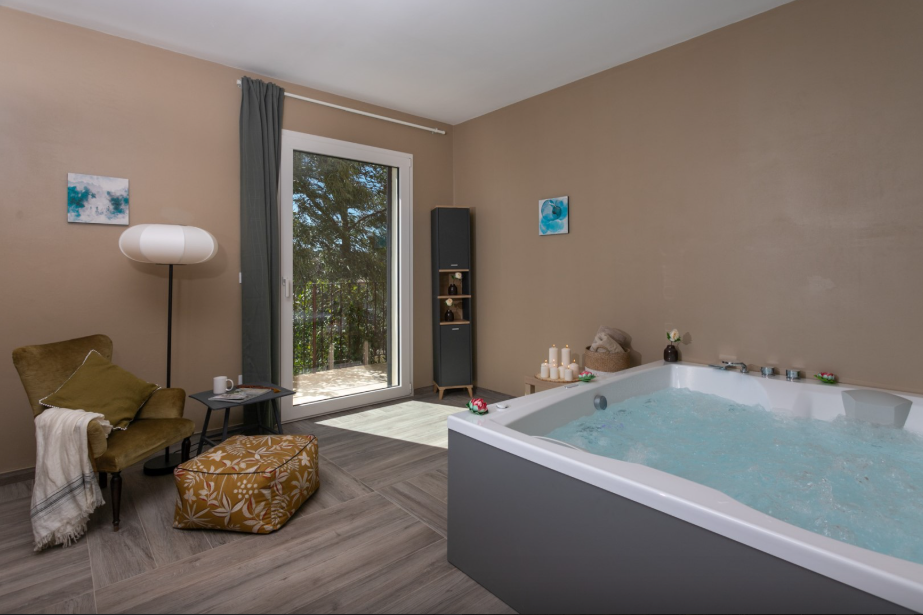 The surrounding 5-hectare grounds include olive trees, natural vegetation, and light-coloured stone. A stone courtyard wraps around three sides of the villa, with outdoor seating areas outside each bedroom. Two dining areas shaded by wooden canopies are located just outside the main living areas, one of which includes a large table and mobile barbecue. The pool terrace and wooden sun deck are a few steps below the main living areas and enjoy wide views over the countryside.