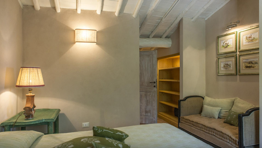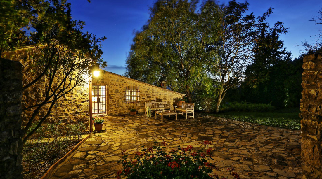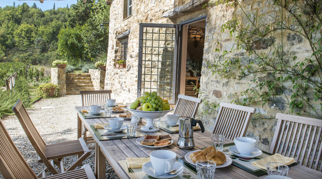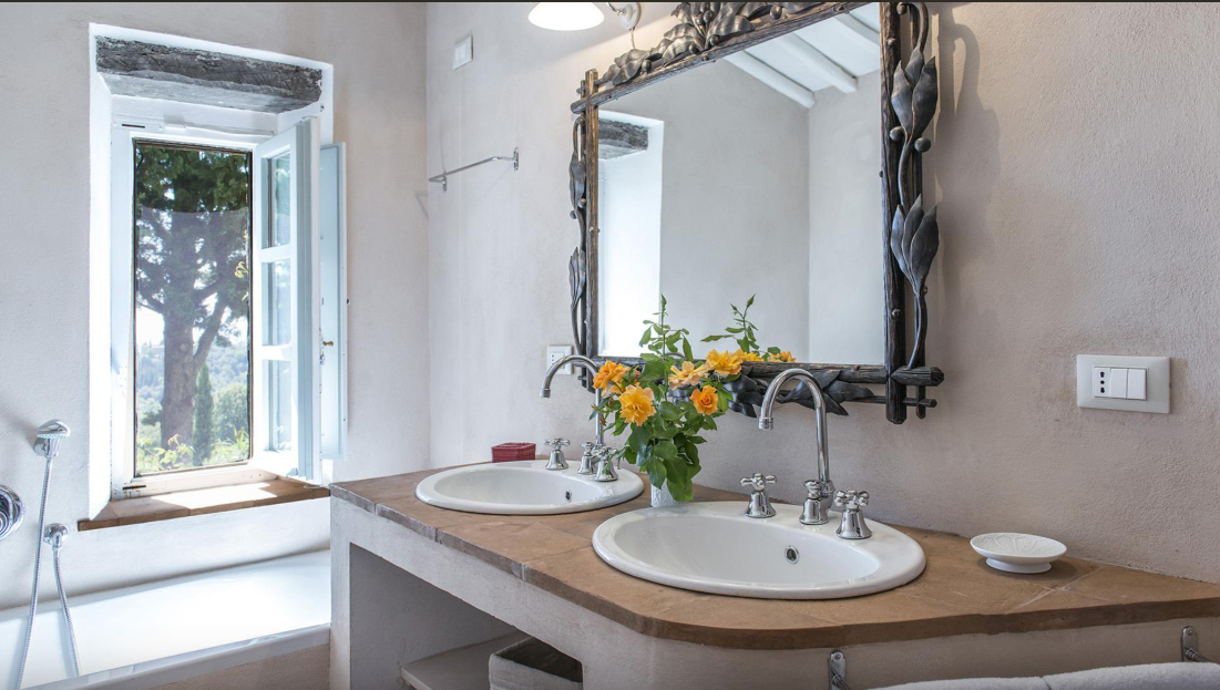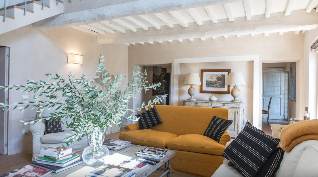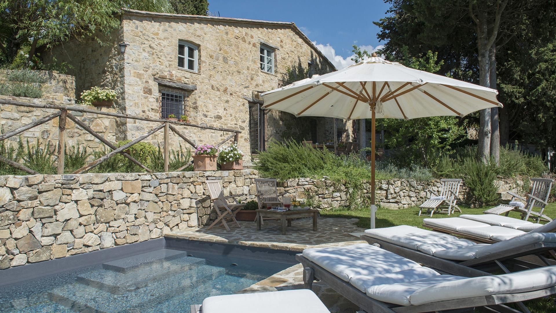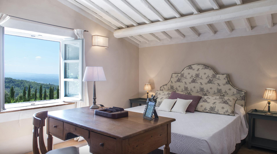 The Villa is located approximately 2 km from the borgo of Castellina in Chianti, in the hilly green countryside between Siena and Florence in the heart of Chianti Classico, a beautiful region famous throughout the world for its picture-postcard views and for the excellence of its wines. It enjoys a privileged position on top of a hill, overlooking the beautiful landscape dotted with olive trees and vines and is surrounded by dense wooded vegetation, ideal for taking long walks in close contact with nature. Inside the exposed stone exterior is a fascinating interior: every room, from the warm intimate bedrooms to the cosy living area, has been designed with great attention to detail, with fine furnishings and accessories, combined with beautiful upholstery that recalls the unmistakable hues of the Sienese countryside.