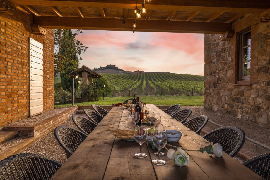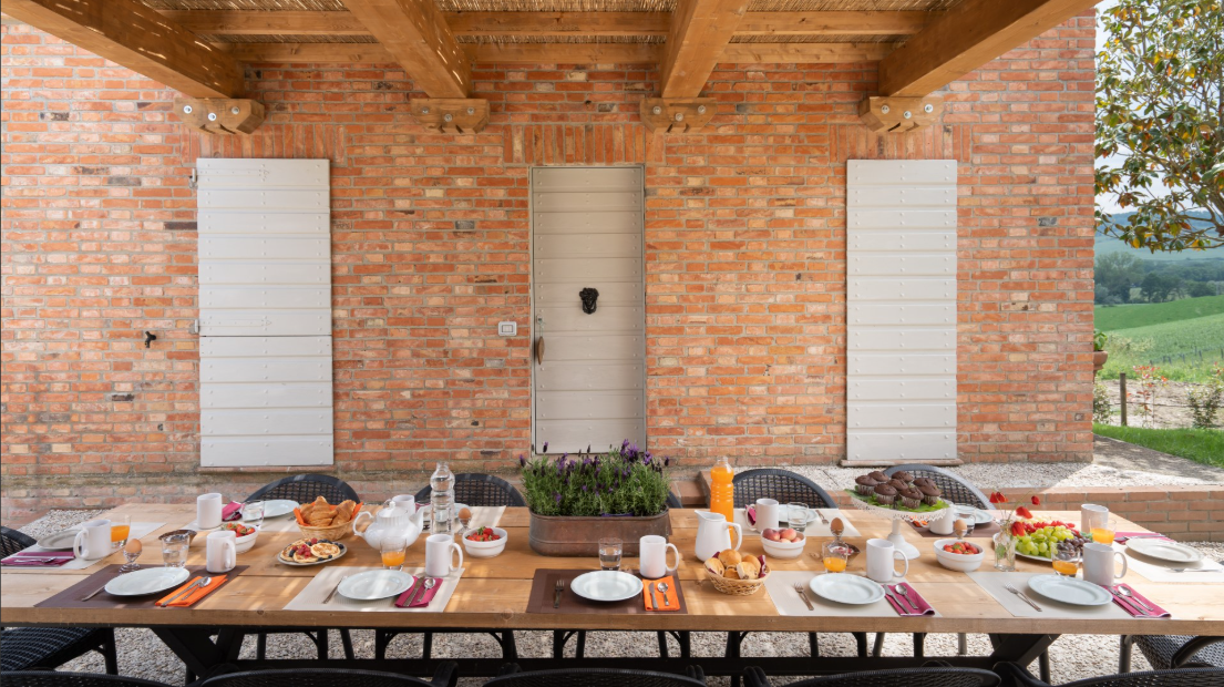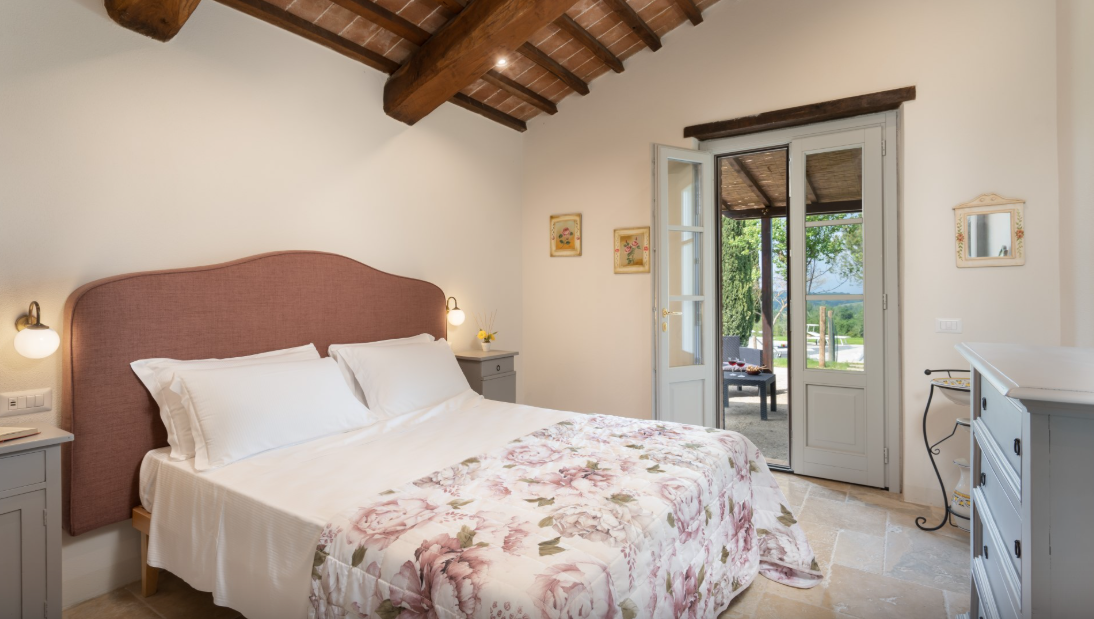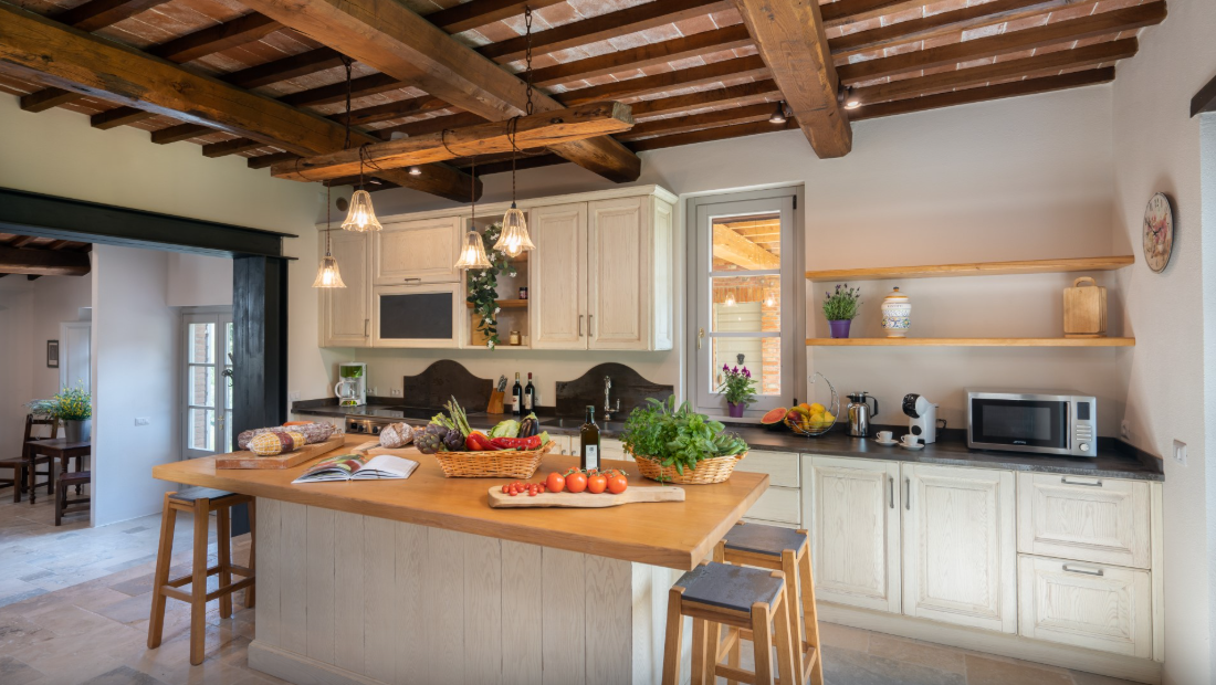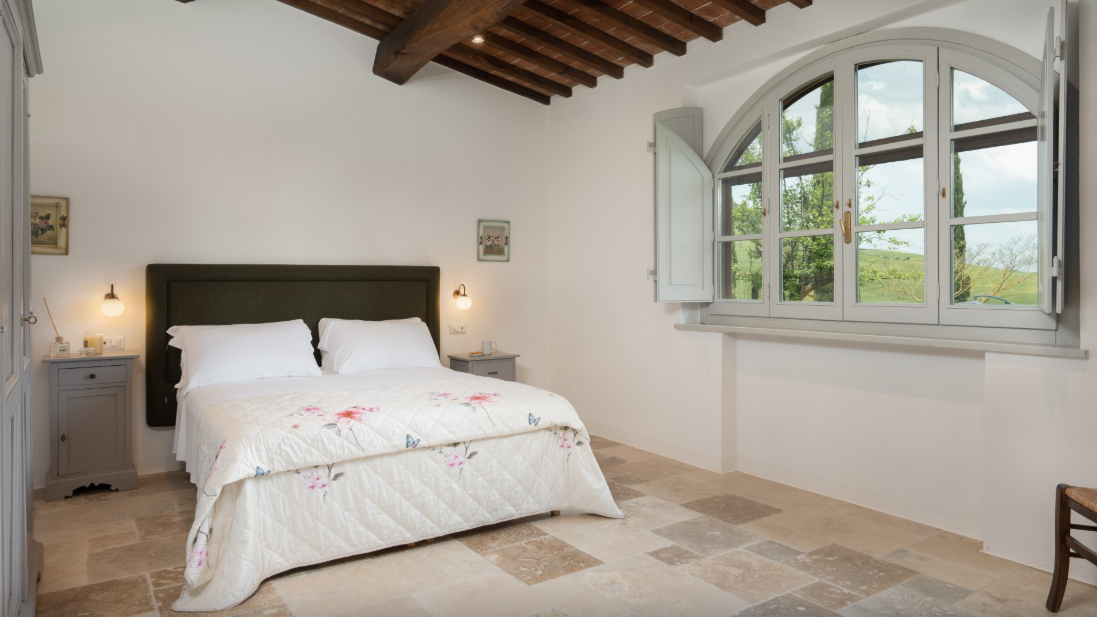The Villa is located in a privileged position, framed by an extraordinary landscape of vineyards: on one side Montepulciano, on the other Montefollonico and Pienza with the picturesque Val di Chiana behind and with the Apennines on the horizon. Built at the end of the 18th century as a farmhouse dedicated to the cultivation of cereals, olive trees and pastures, the recent restoration work, the result of careful and skilful renovation, has bestowed on it charm and features in full respect of local tradition integrated with significant contemporary architectural choices, making it ideal for the holidays of our guests, whether with family, with friends or in couples. The structure has three floors, externally it is a typical Tuscan farmhouse in stone and bricks while internally it has high ceilings with chestnut beams and exposed terracotta tiles.