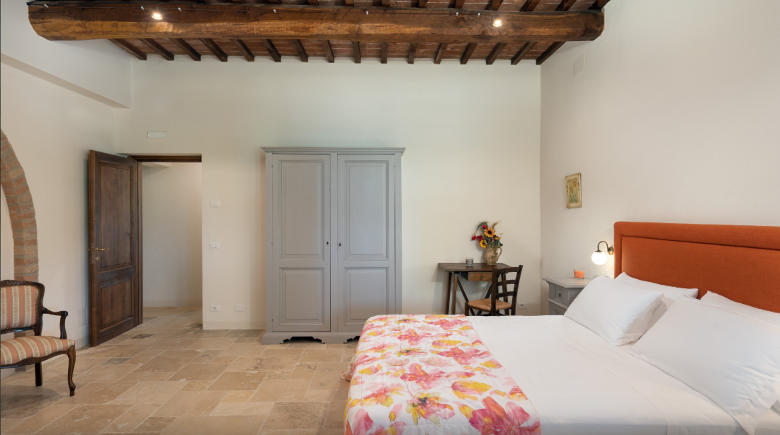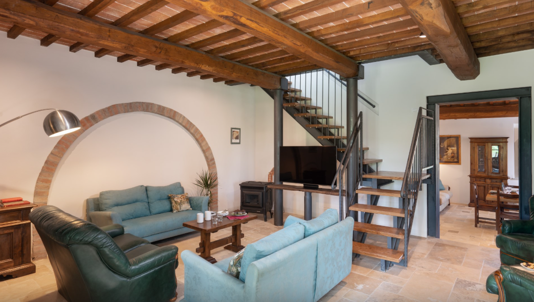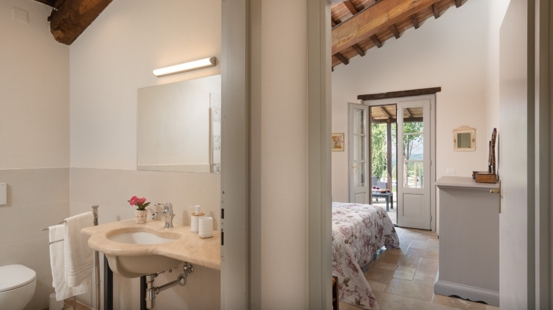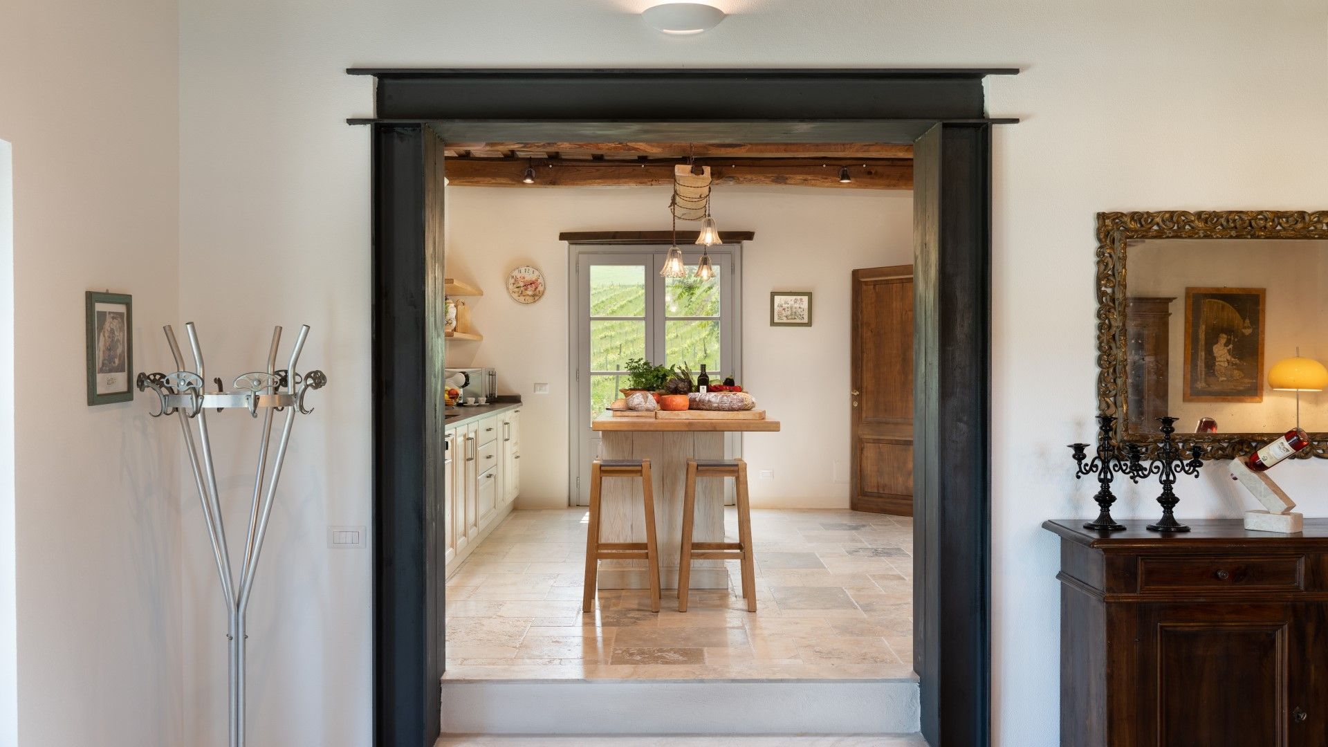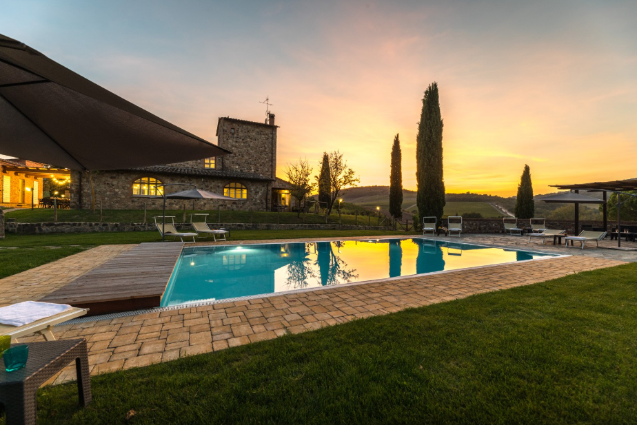 The Villa is located in a privileged position, framed by an extraordinary landscape of vineyards: on one side Montepulciano, on the other Montefollonico and Pienza with the picturesque Val di Chiana behind and with the Apennines on the horizon. Built at the end of the 18th century as a farmhouse dedicated to the cultivation of cereals, olive trees and pastures, the recent restoration work, the result of careful and skilful renovation, has bestowed on it charm and features in full respect of local tradition integrated with significant contemporary architectural choices, making it ideal for the holidays of our guests, whether with family, with friends or in couples. The structure has three floors, externally it is a typical Tuscan farmhouse in stone and bricks while internally it has high ceilings with chestnut beams and exposed terracotta tiles.