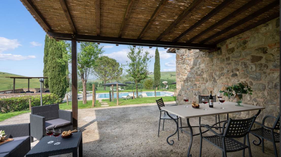 The property extends for about 15 hectares of unfenced terrain with vineyards and arable land. The part around the house and the swimming pool (1800 sq m) is covered in lawn with olive trees, holm oaks and cypresses, rosemary, herbs and laurels. The external dining area, between the dining room and the annex (for private use of the property), is shaded by a natural reed canopy in compliance with the landscape constraints of the area; served by the brick barbecue, it is located a few metres from the kitchen and next to the stone paving that leads to the swimming pool. The pool measures 12 x 6 m with the depth varying from 0.90 to 1.40 m. The stone solarium surrounded by lawn is equipped with sunbeds, umbrellas, small tables and a pergola with outdoor sitting area. The pool is available to guests from the last Saturday in April to the first Saturday in October.