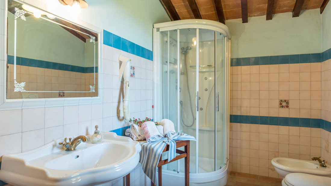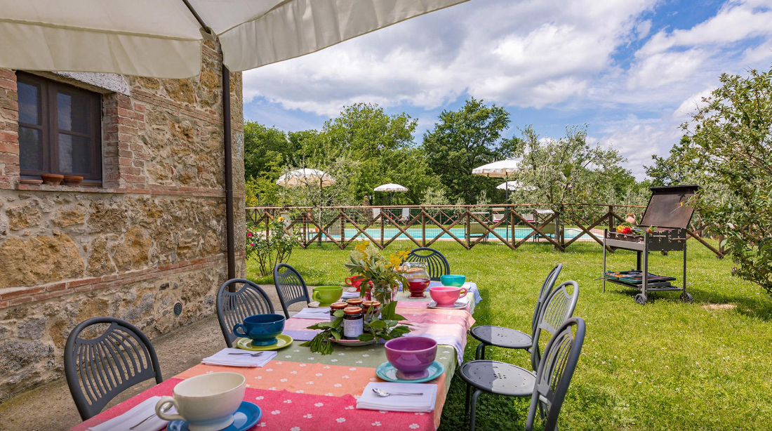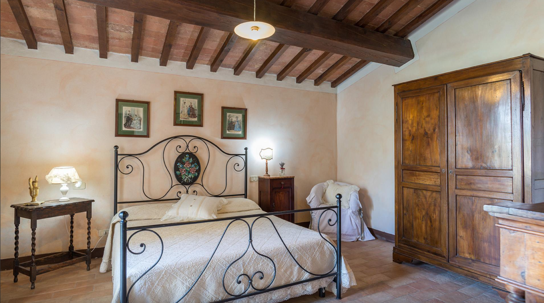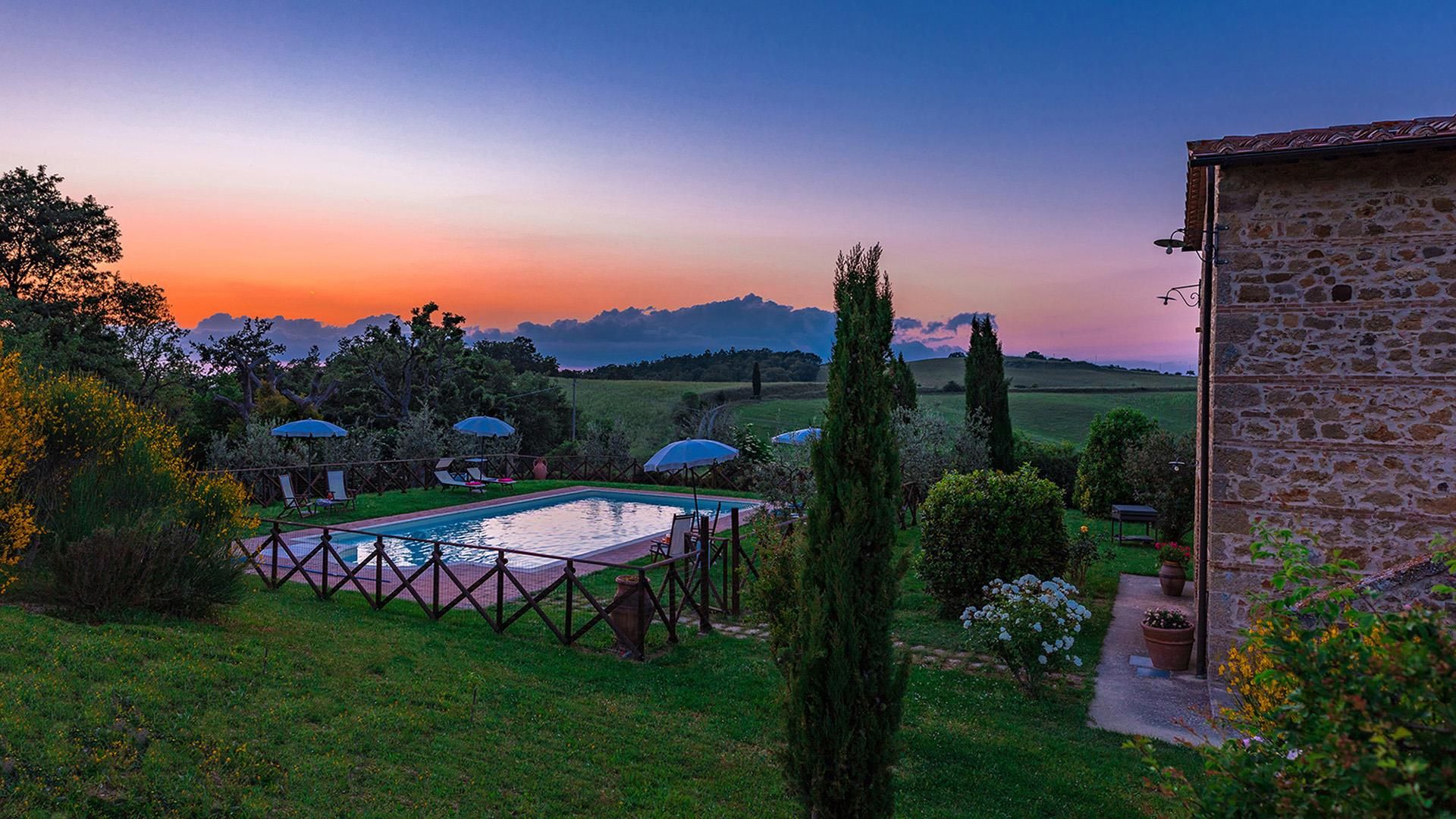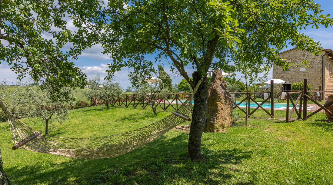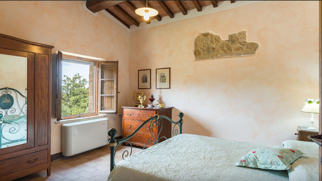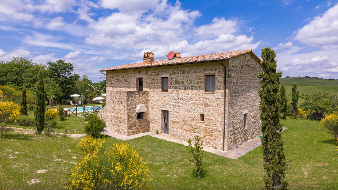 The Villa is a typical Tuscan farmhouse that has been renovated, retaining its rural origin as an old farmer’s home. Entirely clad in stone, the traditionally Tuscan interior of the farmhouse is rustic and very cosy with the added comfort of modern accessories: fully air-conditioned, it has four large bedrooms with private bathroom. The well-kept garden surrounding it, from where you can admire beautiful sunsets from the exclusive pool just a few steps from the entrances, stands in the quiet of the most authentic Tuscan countryside and surrounded by the hills of the Val D’Orcia.