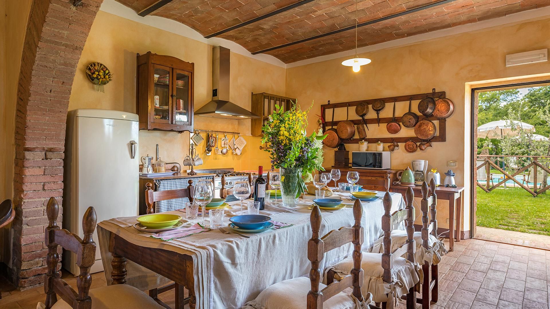 The farmhouse stands within a farm estate that extends for about 135 hectares. The 1000 sq m completely fenced-in park, for exclusive use of guests, consists of a beautiful large lawned garden, full of indigenous shrubs, olive trees, cypresses and flowering bushes. Next to the French window of the living room is the dining area, with a table, a barbecue and a pergola, just a few steps from the swimming pool.