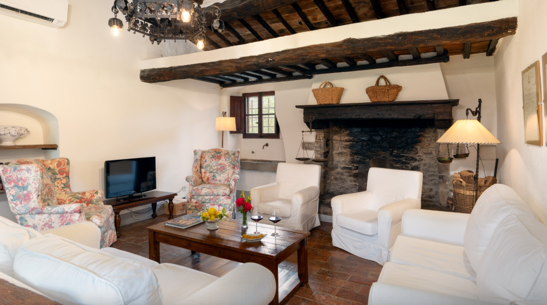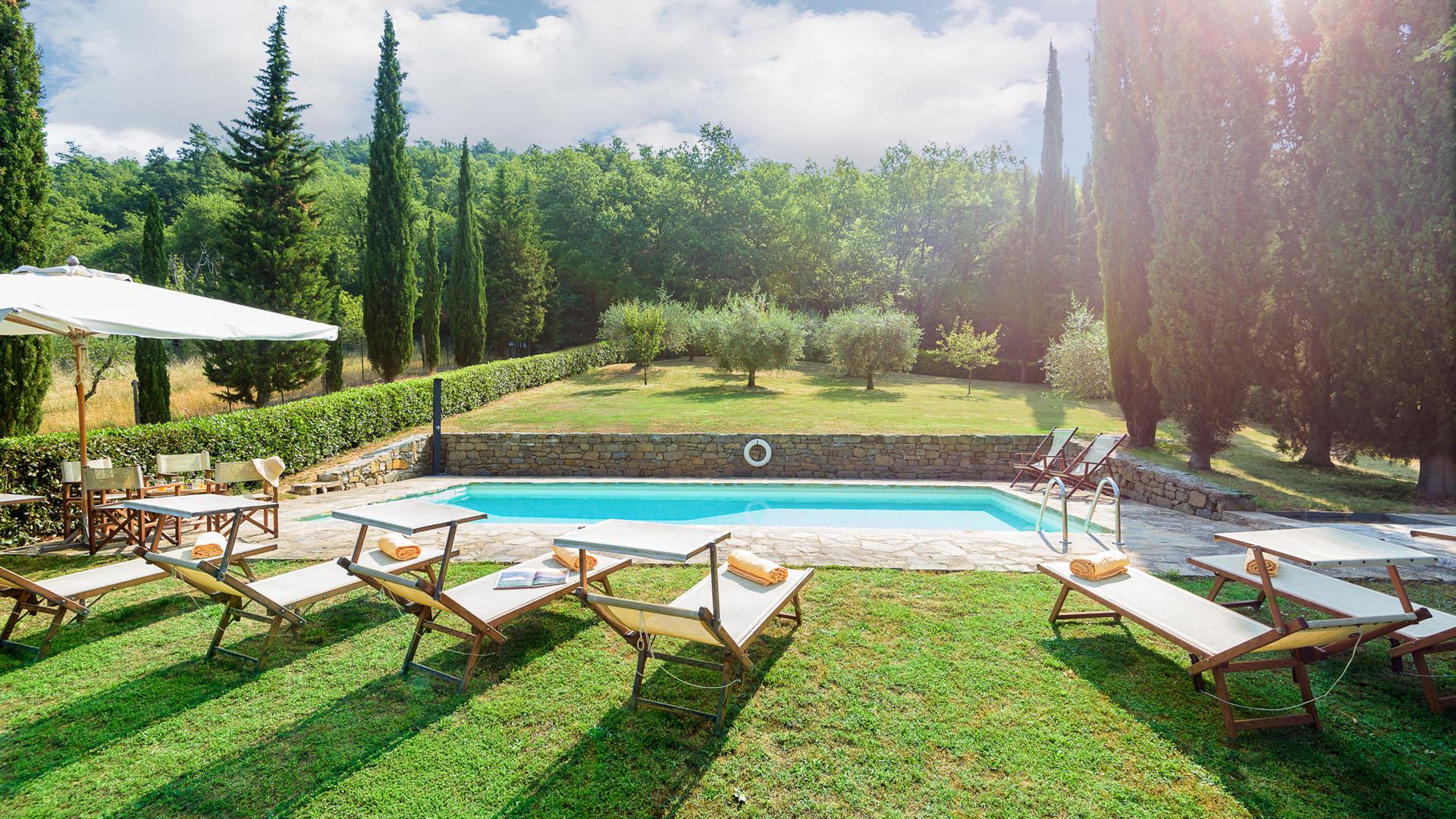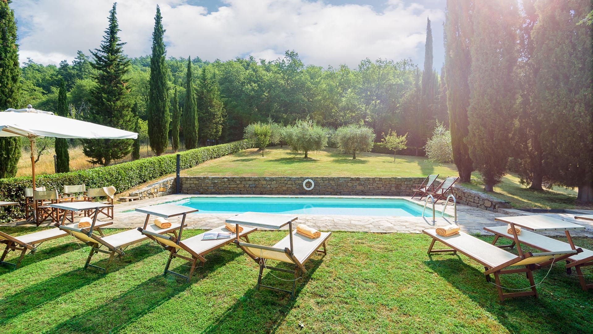 The property stands on the top of a gentle 500 m-high hillslope, surrounded by the dream landscape of the unique hills of Chianti, with dense woods, olive trees and immense rows of vines that stretch to the horizon. It is a 16th century rural Tuscan house in stone which has been renovated following tradition with spacious air-conditioned bedrooms with private bath and with a cosy living area with comfortable armchairs gathered around a large fireplace and surrounded by a green garden where guests can relax in all tranquillity under the panoramic pergola and by the fully-equipped pool. The house stands independantly within the prestigious setting of a wine estate which spreads over 137 hectares.