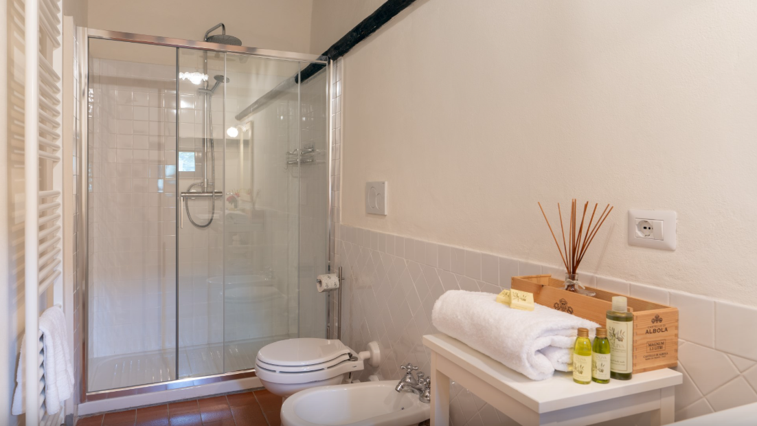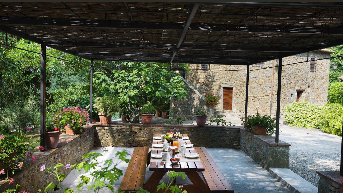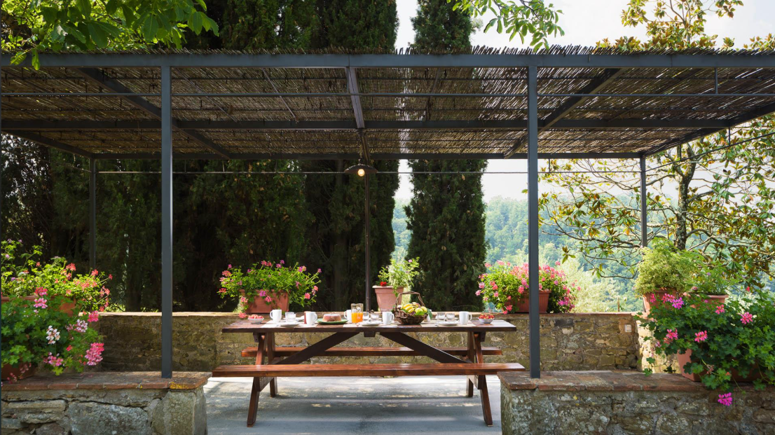 The fully enclosed park of the estate is composed of a green manicured garden with a vast arboreal vegetation, towering cypresses, expanses of olive and fruit trees, rose bushes and vases of red geraniums. The splendid panoramic pergola, just a few steps from the house, is the ideal place for dining or relaxing in the shade, with guaranteed peace and quiet.